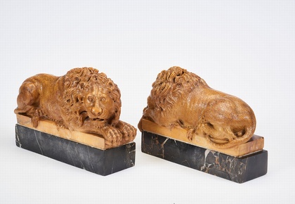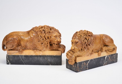 Exquisite Pair of large scale Siena marble lions, after Canova, on Portoro Marble bases.
