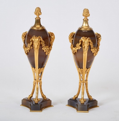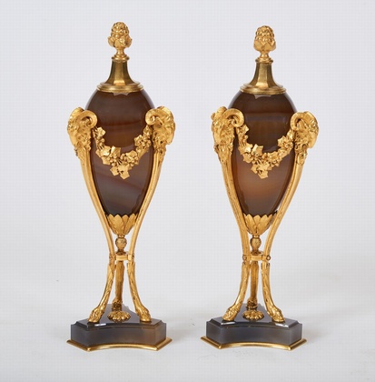 Exquisite pair of French Empire Neoclassical agate and Ormolu Vases with swags and Rams heads.