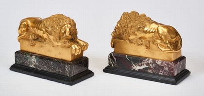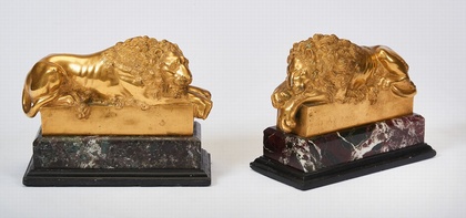 Fine quality pair of gilt bronze Canova lions on Rosso Levanto Marble bases.